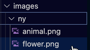 When we render the project, the image path updates to /images/ny/flower.png pointing to the existing flower image in the ny