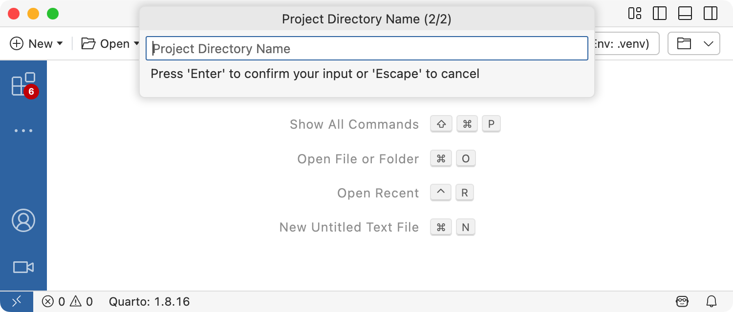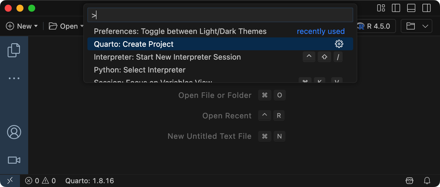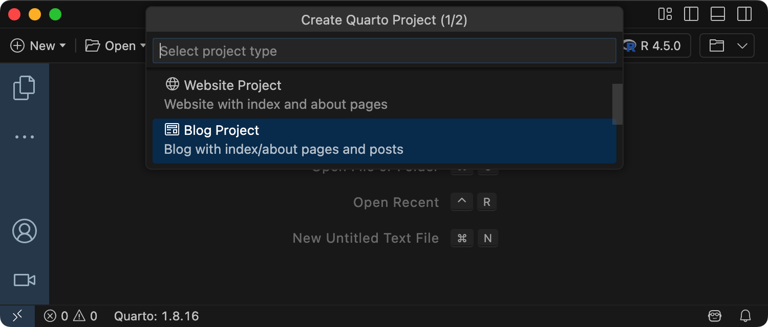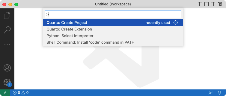 To create a new blog project within VS Code, execute the Quarto: Create Project command from the command-palette: