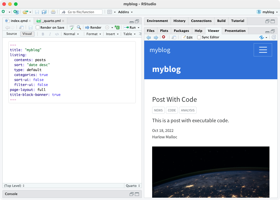 The blog preview will open in a new web browser. As you edit and save index.qmd