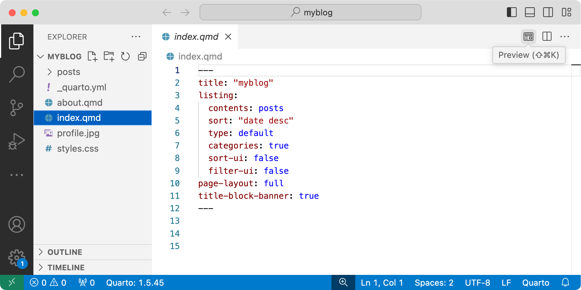 The new blog project will be created and opened within VS Code. Click the Preview button () to preview the blog: